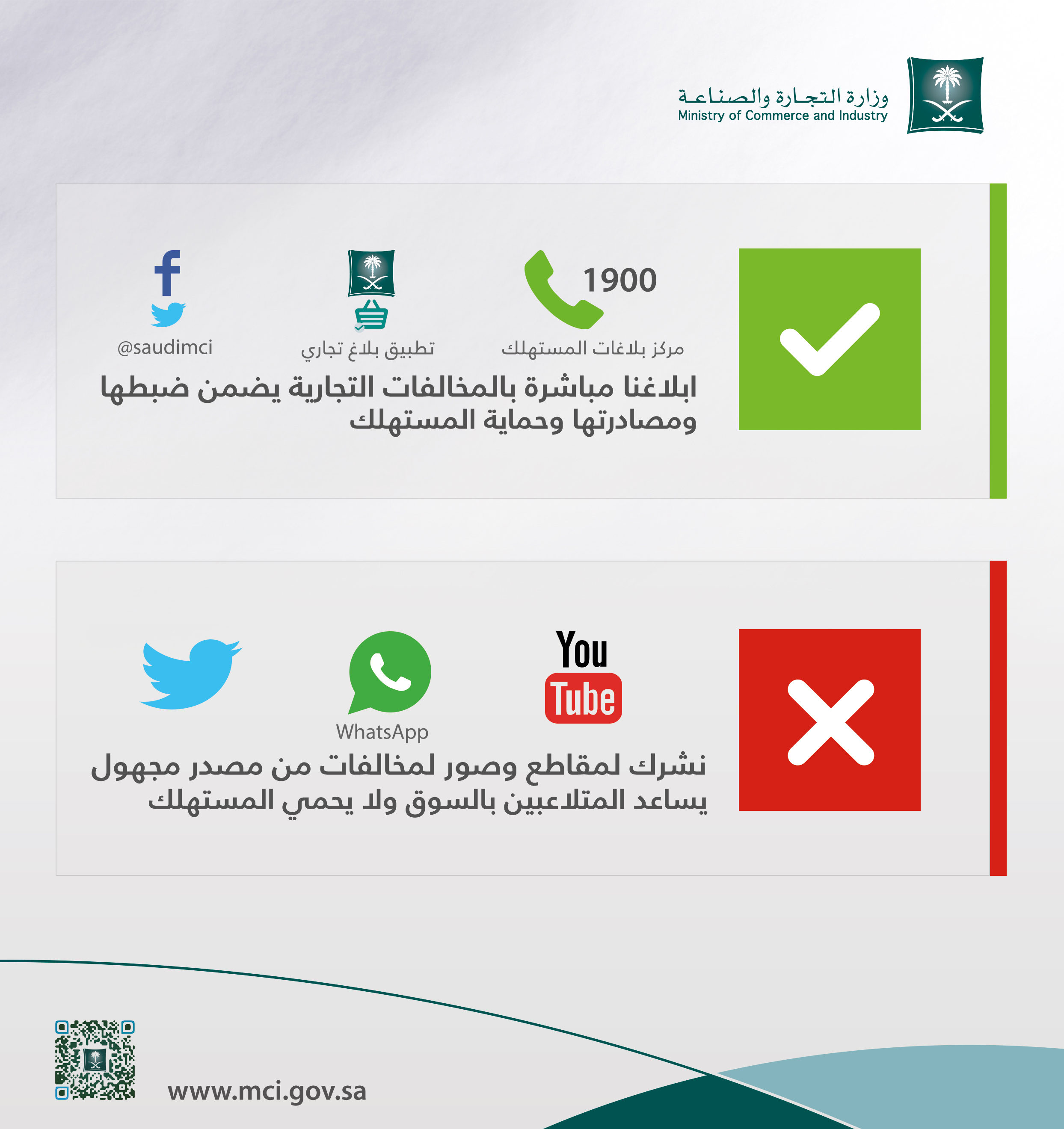 وكذلك لن تتهاون بالحملات الكيدية أو الممارسات التسويقية الغير مشروعة والتي تضر بالمنافسة العادلة ومصالح المستهلك.  وتأمل الوزارة عموم المستهلكين الإبلاغ عن شكاواهم وملاحظاتهم لمركز البلاغات في الوزارة على الرقم ١٩٠٠ أو عبر تطبيق الوزارة الإلكتروني.